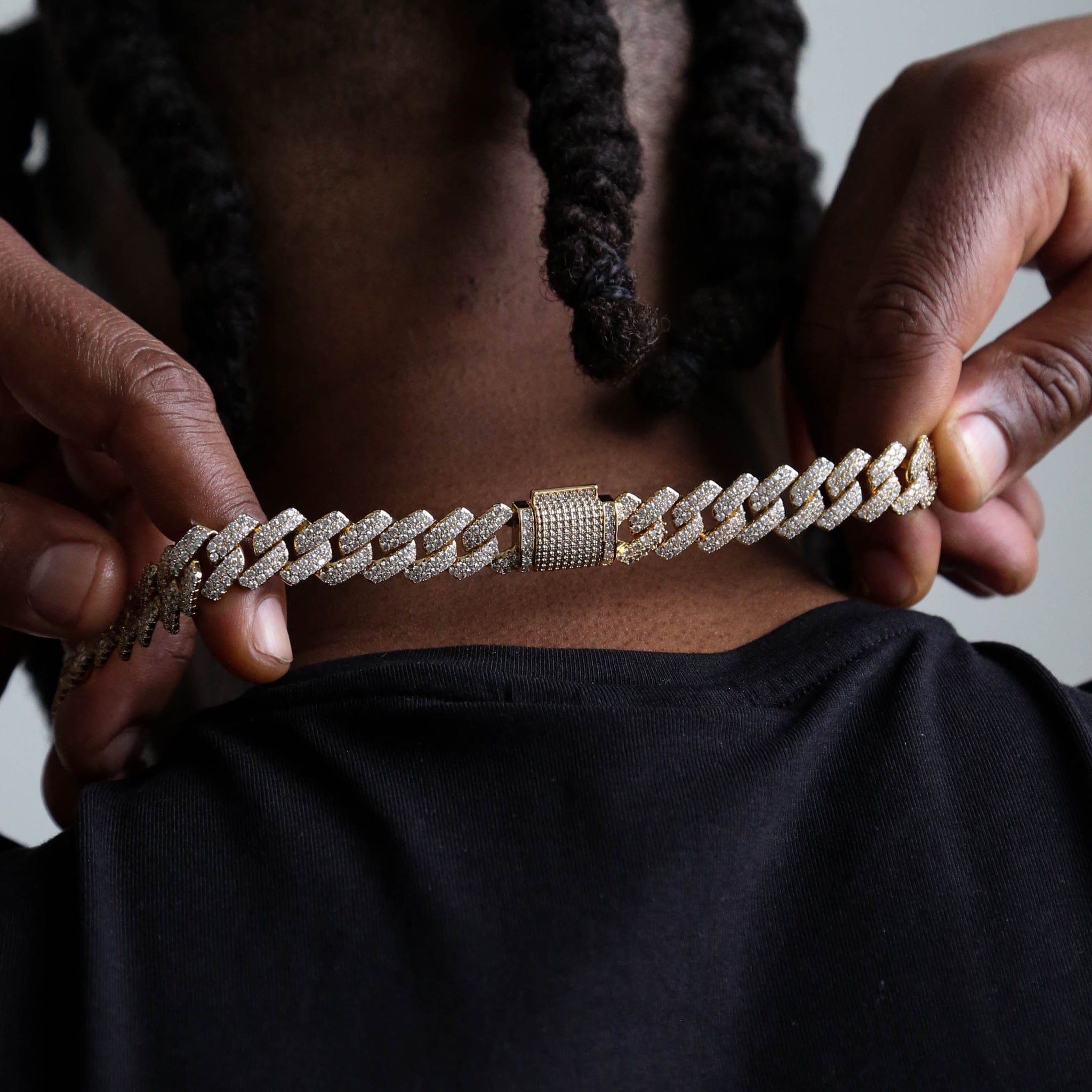 The 12mm Iced Out Cuban Link Chain - Designed to shine harder than anything else in your rotation. This chain is flooded with diamond simulants across every link for maximum brilliance.